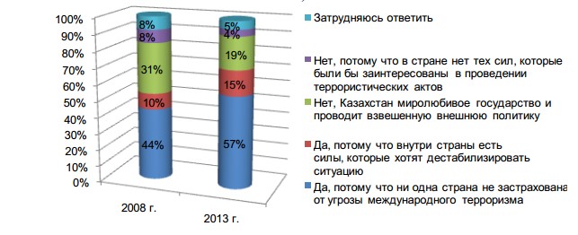 Аналогичный вопрос задавался в 2008 году, когда Казахстан еще оставался «островом стабильности» и разговоры о терроризме носили абстрактный характер. Как показывают результаты, за прошедшие 5 лет почти на 20% выросла доля тех, кто считает, что в Казахстане существует угроза террористических актов. Этот результат вполне ожидаем, так как отражает общую тенденцию обеспокоенности граждан религиозным экстремизмом, проявившим себя за последнее время в полный рост. Диаграмма 2. – Динамика ответов вопроса «Как Вы считаете, существует ли в нашей стране угроза террористических актов?»(2008 и 2013 годы)