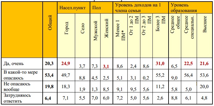 Интересная картина наблюдается при анализе результатов с точки зрения социально-демографических характеристик респондентов. Прежде всего, следует отметить, что жители городов почти в 2 раза чаще, чем сельчане испытывают сильную тревогу в связи с тем, что могут оказаться жертвой терактов. Сельчане в свою очередь склонны проявлять простую настороженность по данному поводу. Так, если в городах каждый четвертый (25%) очень боится терактов, то в селах этот показатель равен 14%. Тот факт, что угроза терактов женщин волнует больше, чем мужчин не вызывает удивления с учетом природной склонности первых к переживаниям. Внимание обращает другое – высокодоходные и образованные граждане чаще опасаются терактов, чем люди с низким материальным достатком и уровнем образования. Таблица 1. – Социально-демографическое распределение результатов по вопросу «Опасаетесь ли Вы сейчас, что Вы сами или Ваши близкие могут оказаться жертвами теракта?»