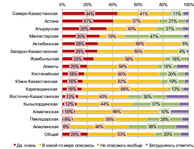 *ПМ – прожиточный минимум Существенную региональную дифференциацию выявило распределение данных в зависимости от области проживания респондентов. Так, наибольшие опасения сложились у жителей Северо-Казахстанской области и г.Астана. В этих регионах более 40% опрошенных жителей сильно опасаются стать жертвами терактов. Также высокий уровень тревожности выявлен во всех западных областях страны – в Атырауской, Мангыстауской, Актюбинской и Западно- Казахстанской областях. Здесь терактов боятся от 28 (ЗКО) до 35% (Атырауская) населения. Превышает общереспубликанские показатели также уровень обеспокоенности терактами в Жамбылской области, где каждый четвертый опрошенный выражает опасения в связи с возможностью терактов. В остальных регионах страны показатели страха перед терактом имеют одинаковое или меньшее значение, чем по республике в целом. Реже всего опасаются террористических актов в Акмолинской, Павлодарской и Алматинской областях. Диаграмма 4. – Распределение данных по областному признаку по вопросу «Опасаетесь ли Вы сейчас, что Вы сами или Ваши близкие могут оказаться жертвами теракта?»