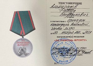 Председатель ДУМ Воронежскойобласти (Воронежский мухтасибат) имам-мухтасиб Рашид Алимурадов удостоен медали «За помощь фронту» приказом командира войсковой части 35390 гвардии полковника А.Ускова.