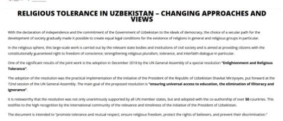 В статье отмечается, что принятие в декабре 2018 года Генассамблеей ООН специальной резолюции «Просвещение и религиозная толерантность» явилось практической реализацией инициативы Президента Узбекистана, выдвинутой на 72-й сессии Генассамблеи ООН. Основной целью предложенной резолюции является «обеспечение всеобщего доступа к образованию, ликвидации безграмотности и невежества».