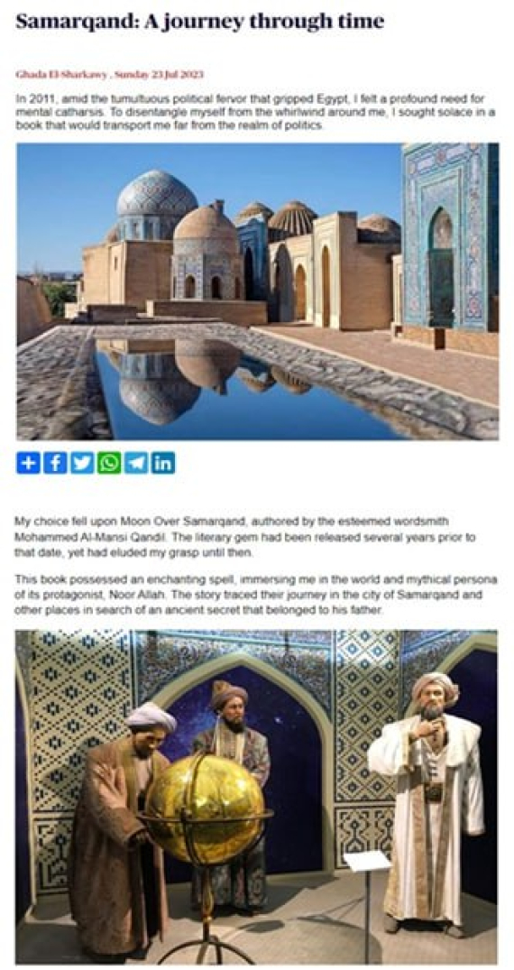 Статья, посвященная туристическому потенциалу древного города Самарканда, принадлежит перу корреспондента газеты “Аль-Ахрам” Гада Аль-Шаркави, побывавшего недавно в Узбекистане для освещения досрочных президентских выборов.