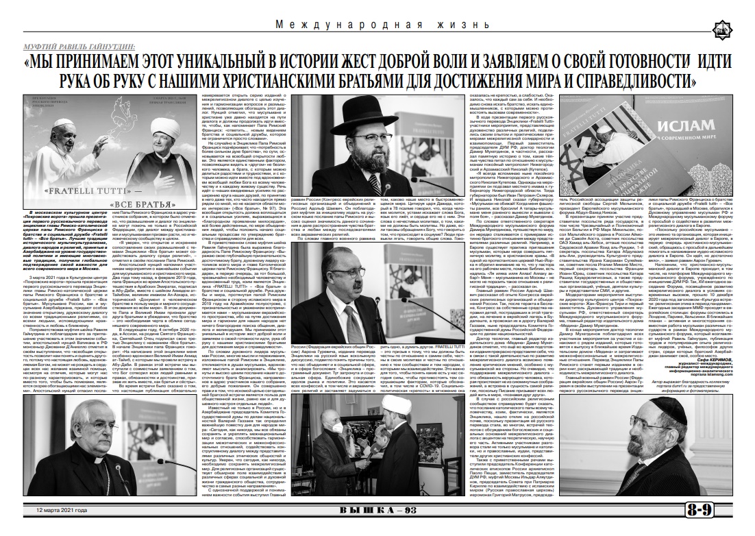 Продолжается публикация отзывов в средствах массовой информации России и других стран по поводу первого в истории перевода на русский язык Энциклики главы Римско-католической церкви Папы Римского Франциска о братстве и дружбе народов мира «Fratelli tutti» – «Все братья».