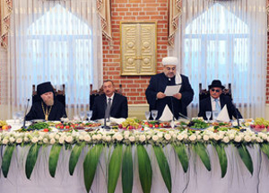 Открывший церемонию председатель УМК Аллахшукюр Пашазаде объявил принятие участие в пятничном ифтаре богоугодным делом. "Всевышний Аллах ниспослал людям богатства для жизни, - сказал он, - самым важным среди которых является значение, придаваемое человечности, нашей духовности и культуре". Приведя слова праведного халифа Али: «Вы учите ваших детей для будущего и обучайте их будущему, т. к. они люди будущего», одной из "основных обязанностей" он назвал сбережение "наших памятников", их восстановление и передача "грядущим поколениям". Глава Управления мусульман Кавказа подчеркнул развитие в сегодняшних условиях, наряду с экономической и политической жизнью, нашего духовного мира, свидетельство чего - в воплощении в стране "спокойствия и равенства". Подтверждение данной линии - в факте участия в церемонии ифтара лидеров традиционных религий – представителей католической и православной церквей, христианской и еврейской общин, названных А.Пашазаде братьями. Отражение в недавно утвержденном Законе «О свободе вероисповедания» положения об открытии в зарубежных странах представительств УМК он очертил в качестве доказательства придания президентом И.Алиевым большого значения развитию национально-духовных ценностей азербайджанцев всего мира. А.Пашазаде также затронул тему мультикультурализма, актуализировав необходимость людей "быть ближе друг другу, общаться друг с другом". В контексте коранического призыва ко взаимопознанию он выразил сожаление формированием "в некоторых западных государствах признаков исламофобии", что "несовместимо с общечеловеческими ценностями". "Люди должны с уважением относиться ко всем религиям, ко всем верованиям, - подчеркнул председатель УМК, - в т.ч. к Корану, Библии и Торе". Добавив, что религиозные традиции и толерантность в Азербайджане "служат примером для всего мира". Выступивший следом глава Бакинской и Прикаспийской епархии Русской Православной церкви Александр (Ишеин) также подчеркнул толерантный характер Азербайджана, где "отношения между государством и религией носят образцовый характер". Он зафиксировал "большое уважение" к православному населению в стране, проявляющимся во внимании и заботе. Председатель Общины горских евреев Азербайджана Семен Ихиилов обратил внимание на исторически сложившиеся "дружеские отношения между азербайджанцами и евреями". "Все нации в стране живут как дружная семья, евреи никогда не сталкивались с антисемитизмом", - сказал он. Ординарий Римской католической церкви в Азербайджане Владимир Фекете одним из факторов знаменательности 2011 г. в отношениях между Баку и Ватиканом обрисовал "подписанное между сторонами соглашение о сотрудничестве", что должно стать "важным этапом" в двусторонних связях. Председатель Албано-удинской религиозной общины Роберт Мобили передал участникам церемонии приветствия удинской общины страны. С его слов, удины, "тысячелетиями живущие в Азербайджане в условиях мира и спокойствия и известные в мире как феноменальный этнос, и сегодня сохраняют свои религиозно-духовные ценности", а село Нидж (расположено в 40 км от райцентра Габала, в 1854 г. здесь открылась первая удинская школа - прим. авт). признано одним из "самых прекрасных мест толерантности". Выступивший президент Ильхам Алиев силой Азербайджана назвал факт спокойного пр