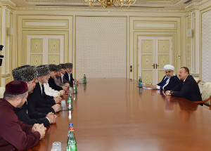 Президент Азербайджана Ильхам Алиев принял членов Высшего религиозного совета народов Кавказа, участвующих в международной конференции на тему «Укрепление религиозной толерантности: (Азербайджанская модель, вызовы в регионе ОБСЕ и за его пределами)». Президент Ильхам Алиев поприветствовал участников встречи. «Я рад снова видеть вас в Баку. Добро пожаловать, с приездом. Рад, что наши встречи имеют регулярный характер. Мы часто встречаемся в Баку, встречались и в других местах Азербайджана. И, конечно, я очень рад, что вы участвуете в международной конференции, которая обсуждает вопросы религиозной терпимости, толерантности. Это очень важная тема сегодня и в нашем регионе, и, в целом, в мире, и на Ближнем Востоке, и в Европе. И Азербайджан со своей стороны старается приложить усилия для того, чтобы было больше понимания между представителями разных религий и народов. Мы регулярно проводим мероприятия. Четыре раза проводили международный гуманитарный форум, где тема религиозной солидарности и толерантности - одна из главных тем, два раза проводили международную конференцию по межкультурному диалогу, также в Баку проводили саммит религиозных руководителей мира. То есть в этом направлении Азербайджан, с учетом истории и географии и сегодняшних реалий, играет важную роль. Ну и, конечно же, вопросы, которые нас объединяют. Это вопросы безопасности мира. На Кавказе - это наши общие темы», - сказал глава государства.