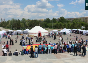 Сегодня у областной мечети развернулась большая ярмарка. Сразу после пятничного намаза сотни прихожан идут прямиком сюда. Если на одних прилавках   предлагают «хэндмэйд», то на других - хозяйственные товары по низкой цене. Ассортимент товаров достаточно большой. В юрте, например, предлагали различные национальные блюда. Особым же спросом пользовались кожаные изделия, привезенные из Монголии.