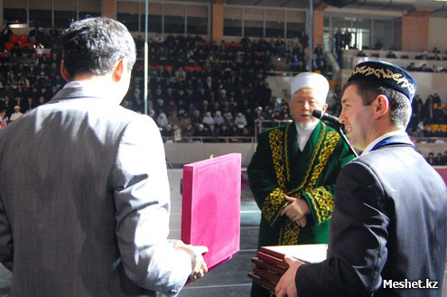 В Алматы в субботу 5 марта прошло мероприятие, приуроченное мавлиду. Несмотря на то, что этот день был объявлен рабочим днем в Казахстане, во Дворце спорта им. Б.Шолака не было свободных мест, а это более 5000 человек. Праздничное настроение чувствовалось уже у подхода к Дворцу спорта. Многолюдная толпа с 8 утра ожидала начала мероприятия. Зайдя вовнутрь, многие люди были удивлены столь масштабной сценой и работой организаторов данного мероприятия. Каждого пришедшего гостя также ожидал подарок в виде нескольких книг на исламскую тематику. С приветственной речью ко всем собравшимся обратился председатель Духовного управления мусульман Казахстана Абсаттар хажи Дербисали. В своей речи он поздравил всех гостей со знаменательным праздником мавлид, а также рассказал о жизни пророка Мухаммада (мир ему). Местные чтецы Корана, среди которых были наиб-имамы центральной мечети Алматы - Жумабаев Данияр и Садырханов Жуманазар возглавили чтение мавлида. Зрелище было фееричным, все гости в один голос распевали «Аллахумма салли аля Мухаммад ва аля али Мухаммад» (О, Аллах! Благослови Мухаммада, его семью и потомков). Атмосфера всего зала была пропитана благодатью и любовью к Аллаху и Его посланнику (мир ему). На больших экранах был показан специально подготовленный фильм о посланнике Аллаха (мир ему), совместная работа ДУМ Казахстана и телеканала «Асыл Арна». Стоит отметить работу данного телеканала, так как их вклад был особо значим на данном мероприятии. Сотрудники телеканала транслировали все происходящее на экраны в зале, а также производили полную запись данного мероприятия. Среди приглашенных гостей были видные политические деятели, поэты, районные имамы, и представители мусульманских диаспор, проживающих в Казахстане. На должном уровне прошло выступление местных представителей казахстанской эстрады, репертуар которых был на исламскую тему. По окончании мероприятия глава ДУМ Казахстана Абсаттар хажи Дербисали лично вручил благодарственные дипломы и памятные сувениры заслуженным деятелям и работникам СМИ, которые имеют непосредственное отношение к развитию ислама в Казахстане. По материалам сайта Центральной мечети города Алматы и ДУМ Казахстана Фотовыставка:URL: |
