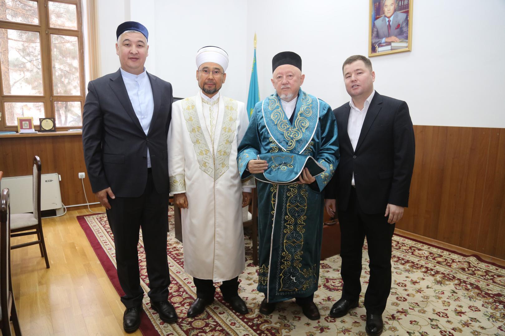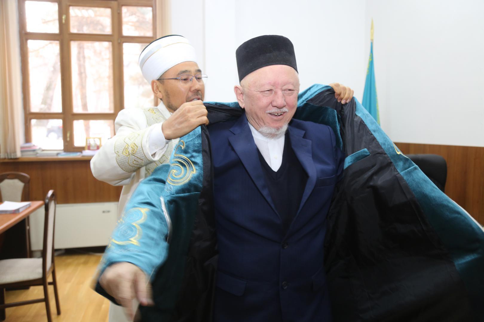 Серикбай кажы Ораз, председатель Духовного управления мусульман Казахстана, встретился с бывшими верховными муфтиями - Ратбеком кажы Нысанбайулы, Абсаттаром кажы Дербисали, Ержаном кажы Малгажыулы - в Алматы и по казахским обычаям подарил шапаны религиозным лидерам по случаю 30-летия муфтият.