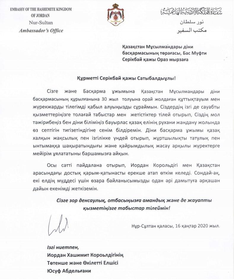 Чрезвычайный и Полномочный Посол Иорданского Хашимитского Королевства в Казахстане Юсуф Абдельгани направил приветственное письмо Верховному муфтию Серикбаю кажы Оразу.