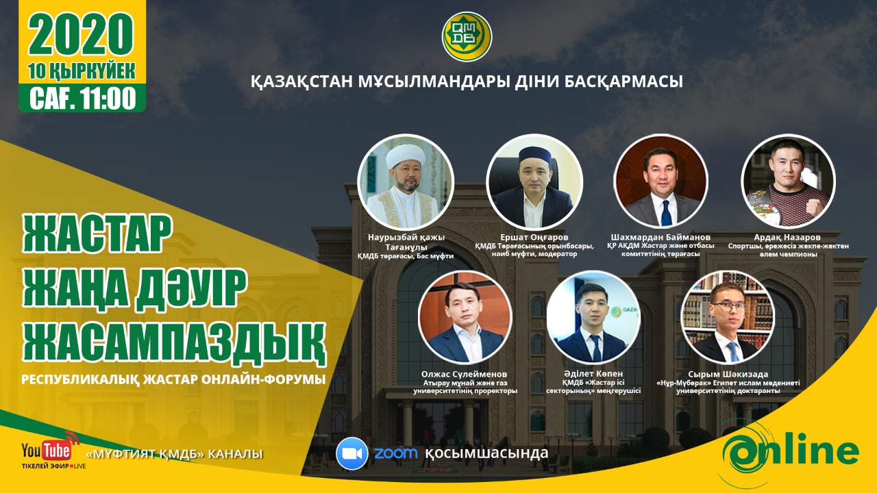 В форуме примут участие Председатель ДУМК, Верховный муфтий Наурызбай кажы Таганулы, заместитель председателя, наиб муфтий Ершат кажы Онгаров, председатель Комитета по делам молодежи и семьи Министерства информации и общественного развития Шахмардан Байманов, чемпион мира по боевым искусствам Ардак Назаров, проректор Атырауского университета нефти и газа Олжас Сулейменов, заведующий Сектором по делам молодежи ДУМК Адилет Копен, докторант Университета Нур-Мубарак Сырым Шакизаде, а также известные представители молодежных организаций и студенты. Форум будет транслироваться в прямом эфире на YouTube-канале Духовного управления.