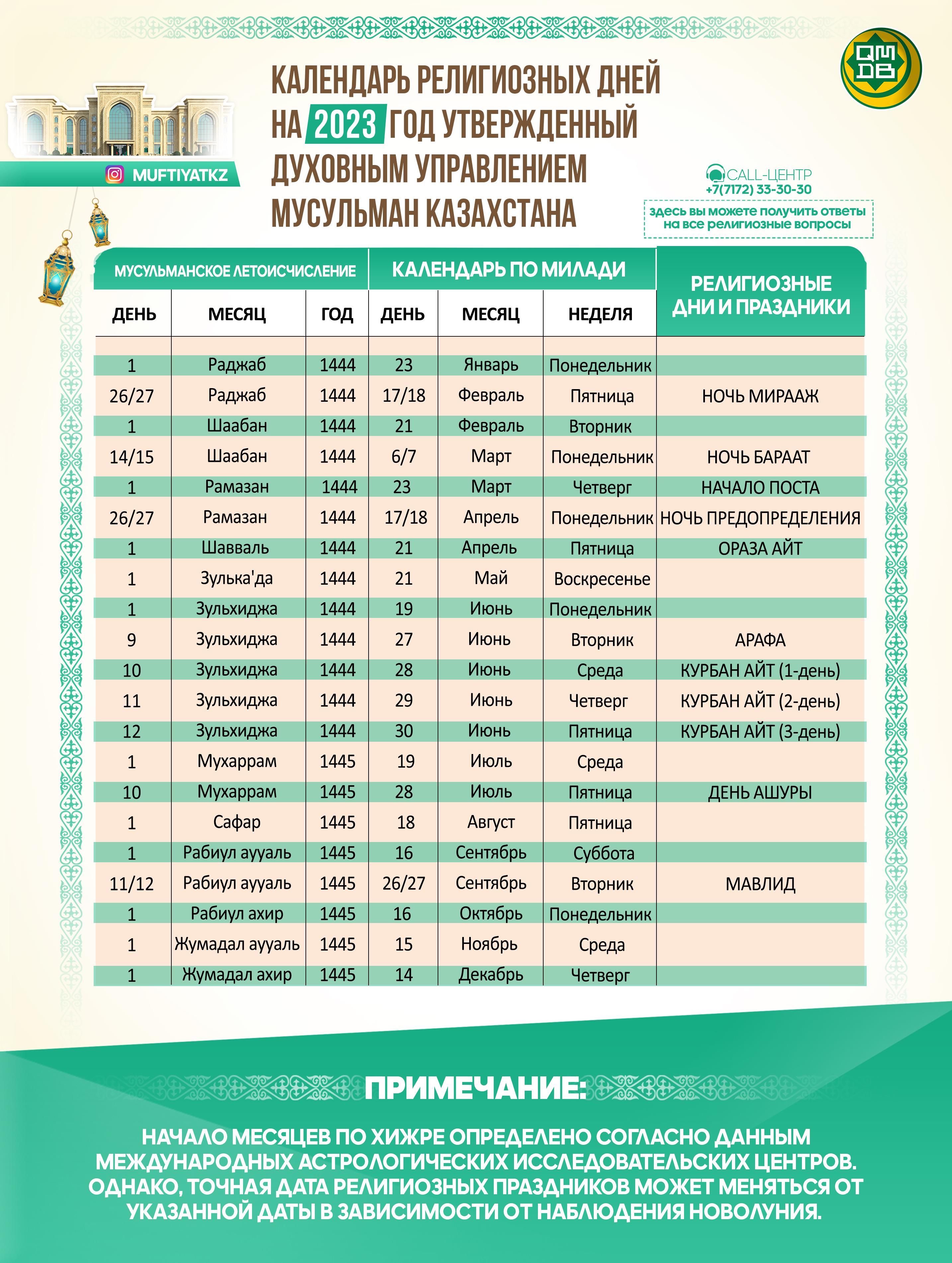 Отдел шариата и фетвы Духовного управления мусульман Казахстана утвердил расписание религиозных дней на 2023 год.