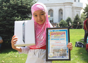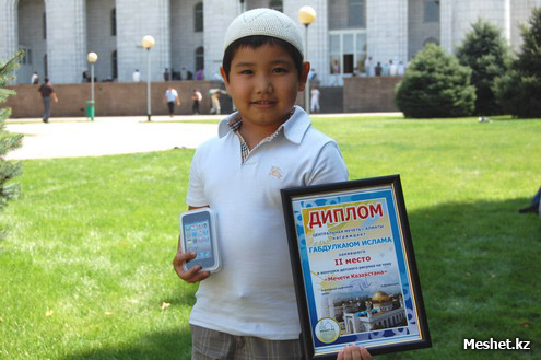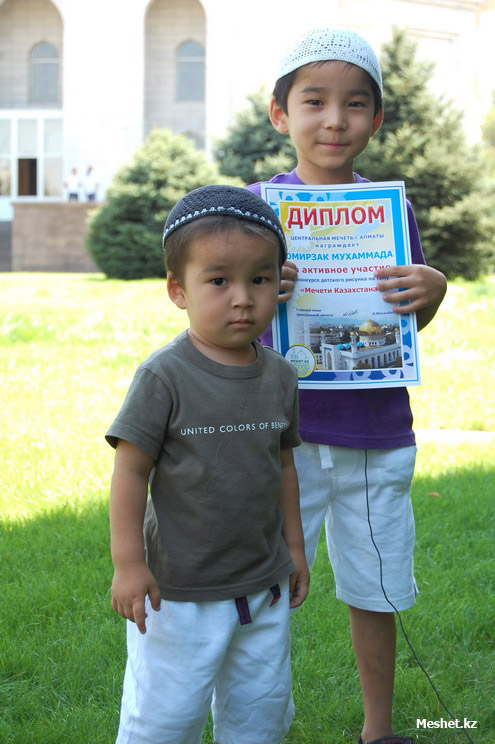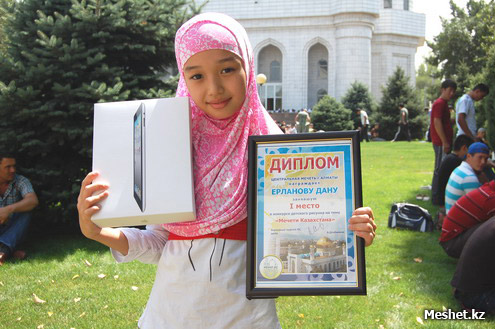 5 августа в Центральной мечети г.Алматы состоялось официальное поздравление победителей первого республиканского конкурса детского рисунка «Мечети Казахстана». Об этом сообщает портал «Ислам в СНГ» со ссылкой на официальный сайт ДУМ Казахстана. Победителей лично награждали Верховный муфтий Казахстана Абсаттар хажи Дербисали, главный имам Центральной мечети г.Алматы Кулмухаммад Маханбет и официальный представитель компании "iPoint", являющейся генеральным спонсором конкурса. Напомним, что данный конкурс проходил в поддержку международного дня защиты детей. Готовые работы принимались в период с 1 июня по 1 августа 2011 года. В общем итоге организаторам поступило более 300 картин со всех регионов республики. Как и ожидалось, большая часть активных участников была из города Алматы, это около 90% всех работ. Юные конкурсанты чаще всего изображали в своих картинах Центральную мечеть г.Алматы, Центральную мечеть г.Астаны "Нур-Астана", также излюбленной мечетью конкурсантов оказалась Центральная мечеть г.Актобе "Нур Гасыр". По причине большого количества конкурсных работ, главный имам Центральной мечети Кулмухаммад Маханбет принял решение о выделении еще дополнительных 20 поощрительных призов и дипломов для самых лучших рисунков. Основным требованием конкурса было самостоятельная работа самого ребенка, без какой-либо помощи со стороны взрослых. «Во время отбора призовых мест мы столкнулись с тем, что "самые лучшие картины" были нарисованы при помощи взрослых. Данные работы сразу же исключались из конкурса», - говорят организаторы. Отбором призовых мест занималась специальная комиссия, среди которых был выпускник Казахской Национальной Академии Искусств им.Т.Жургенова - Болатбаев Курмет, наиб имам Центральной мечети г.Алматы - Иминов Нурмухаммад и другие сотрудники ДУМ Казахстана. Победителями данного конкурса стали: 1 место - Ерланова Дана, 9 лет, г.Алматы