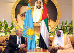 Вчера 13 февраля в рамках рабочего визита в Объединенные Арабские Эмираты президент Казахстана Нурсултан Назарбаев встретился и провел переговоры с президентом ОАЭ шейхом Халифой бен Заидом Аль Нахаяном, сообщает пресс-служба Президента Казахстана. Стороны обсудили актуальные вопросы двустороннего сотрудничества в политической, торгово-экономической и инвестиционной сферах. Стороны отметили схожесть позиций по актуальным проблемам в регионе Ближнего Востока и Северной Африки, современного мироустройства. В частности, обсуждая ситуацию в Сирии, главы государств отметили необходимость принятия дипломатических мер в целях стабилизации положения и во избежание силового противостояния. Нурсултан Назарбаев подчеркнул, что Казахстан выступает за скорейшую нормализацию ситуации вокруг Ирана, а также Сирии, будет проводить активную работу в рамках председательства в Организации исламского сотрудничества. Нурсултан Назарбаев и шейх Халифа бен Заид Аль Нахаян высоко оценили существующий потенциал в развитии торгово-экономического и инвестиционного сотрудничества. В ходе состоявшихся переговоров была отмечена необходимость активизации работы, с тем, чтобы подписать в ближайшее время соглашения о сотрудничестве и взаимопомощи в таможенных делах, о поощрении и взаимной защите инвестиций, а также провести очередной раунд переговоров по проекту соглашения о воздушном сообщении между Казахстаном и ОАЭ. Стороны высоко оценили успешное исполнение договоренностей по реализации масштабных инвестиционных проектов. Президент Казахстана подчеркнул, что в настоящее время проект многофункционального комплекса «Абу Даби Плаза», осуществляемый компанией «Алдар Пропертиз», перешел в фазу практических строительных работ. В этой связи, Нурсултан Назарбаев выразил надежду, что проект будет реализован согласно срокам, обозначенным в межправительственном соглашении о строительстве комплекса. Стороны выразили удовлетворение успешной деятельностью банка «Аль-Хиляль», единственного исламского банка на постсоветском пространстве. Наглядным подтверждением активизации работы банка, начавшего функционировать в Казахстане с 2009 года, является намерение открыть в Шымкенте третий филиал, после Астаны и Алматы. Особую роль в активизации торгово-экономического и инвестиционного сотрудничества между двумя странами должны играть представители малого и среднего бизнеса. Стороны отметили необходимость их поддержки, а также создания благоприятных условий для развития партнерских отношений, в частности, посредством работы казахстанско-эмиратского Делового совета. В тот же день Нурсултан Назарбаев провел встречу и переговоры с заместителем Верховного главнокомандующего ВС ОАЭ, наследным принцем эмирата Абу Даби шейхом Мухаммедом бен Заидом Аль Нахаяном, на которых также обсуждались вопросы дальнейшей активизации двустороннего сотрудничества в различных сферах. IslamSNG.com