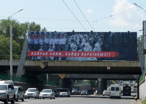 В Бишкеке появились крупноформатные баннеры с изображением женщин в национальной кыргызской одежде и женщин в парандже. Под баннерами написано: «Кайран эл кайда баратабыз?» (Народ, куда мы катимся?)