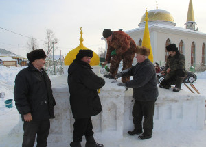 В первый день с помощью трактора творцы сгребли в кучу снег напротив мечети. Затем слепили из снега храм и покрасили. Как признаются участники конкурса, им нравится заниматься творчеством. В изготовлении макета они поучаствовали с большой охотой.