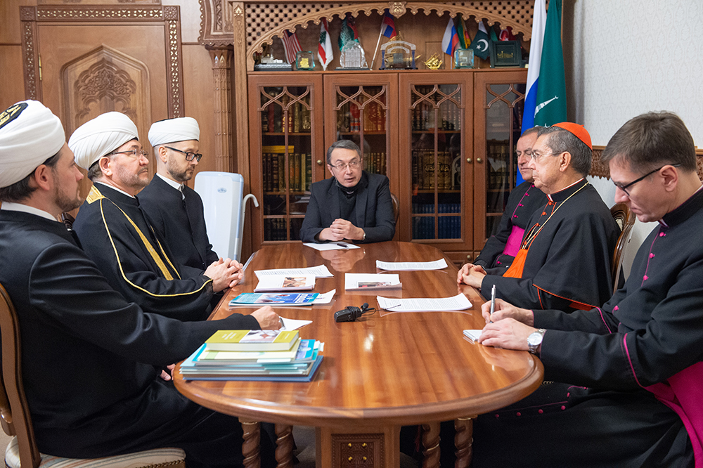 Поприветствовав высоких гостей, муфтий Гайнутдин ознакомил с историей взаимоотношений ДУМ РФ с Римской католической церковью, начало которых положено в 1994 году, когда делегация ДУМЦЕР во главе с председателем муфтием шейхом Равилем Гайнутдином приняла участие в VI Всемирной Ассамблее Международной конференции – «Религия и мир». В рамках Ассамблеи в Ватикане состоялась встреча делегатов с папой Иоанном Павлом II. Рассказывая об исламско-католических взаимоотношениях в современной России, муфтий Гайнутдин отдельно отметил первую в истории России совместную конференцию «Ислам и христианство: на пути к диалогу», которая состоялась 24 ноября 2005 года в резиденции Духовного управления мусульман и была приурочена к 40-летию со дня принятия II Ватиканским собором Декларации об отношении Церкви к нехристианским религиям "Nostra Aetate". В работе конференции тогда принял участие митрополит Архиепархии Божией Матери в Москве архиепископ Тадеуш Кондрусевич. Говоря о современном этапе, духовный лидер российских мусульман акцентировал внимание на переводе и издании на русском языке энциклики папы Римского Франциска «Все братья».