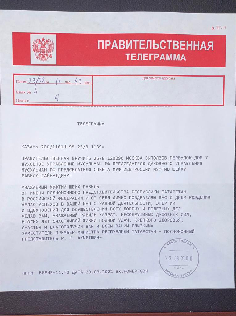 Телеграммы и поздравительные письма в адрес муфтия шейха Равиля Гайнутдина26.08.2022 | Новости