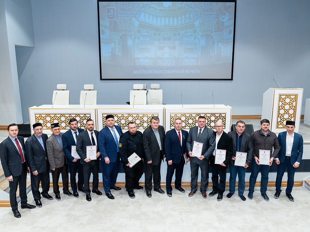 Сегодня в Московской Соборной мечети от имени заместителя мэра Москвы в правительстве Москвы А.Н. Горбенко и руководителя Департамента национальной политики и межрегиональных связей города Москвы В.И. Сучкова вручены Благодарственные письма сотрудникам ДУМ РФ и ЧОП «Булат», ответственным за поддержание правопорядка на территории главной российской мечети.
