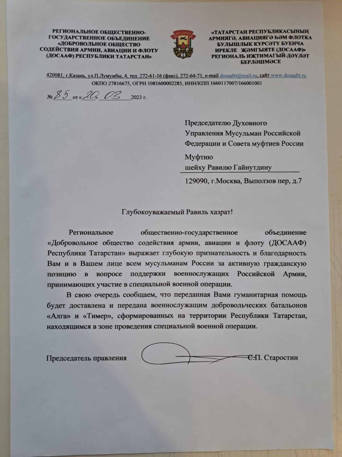 Председатель правления регионального общественно-государственного объединения ДОСААФ Республики Татарстан Сергей Старостин в благодарственном письме на имя главы ДУМ РФ муфтия шейха Равиля Гайнутдина выразил духовному лидеру российских мусульман глубокую признательность и благодарность «за активную гражданскую позицию в вопросе поддержки военнослужащих российской армии, принимающих участие в специальной военной операции». Руководитель ДОСААФ Республики Татарстан также отметил, что гуманитарный груз будет доставлен по назначению.