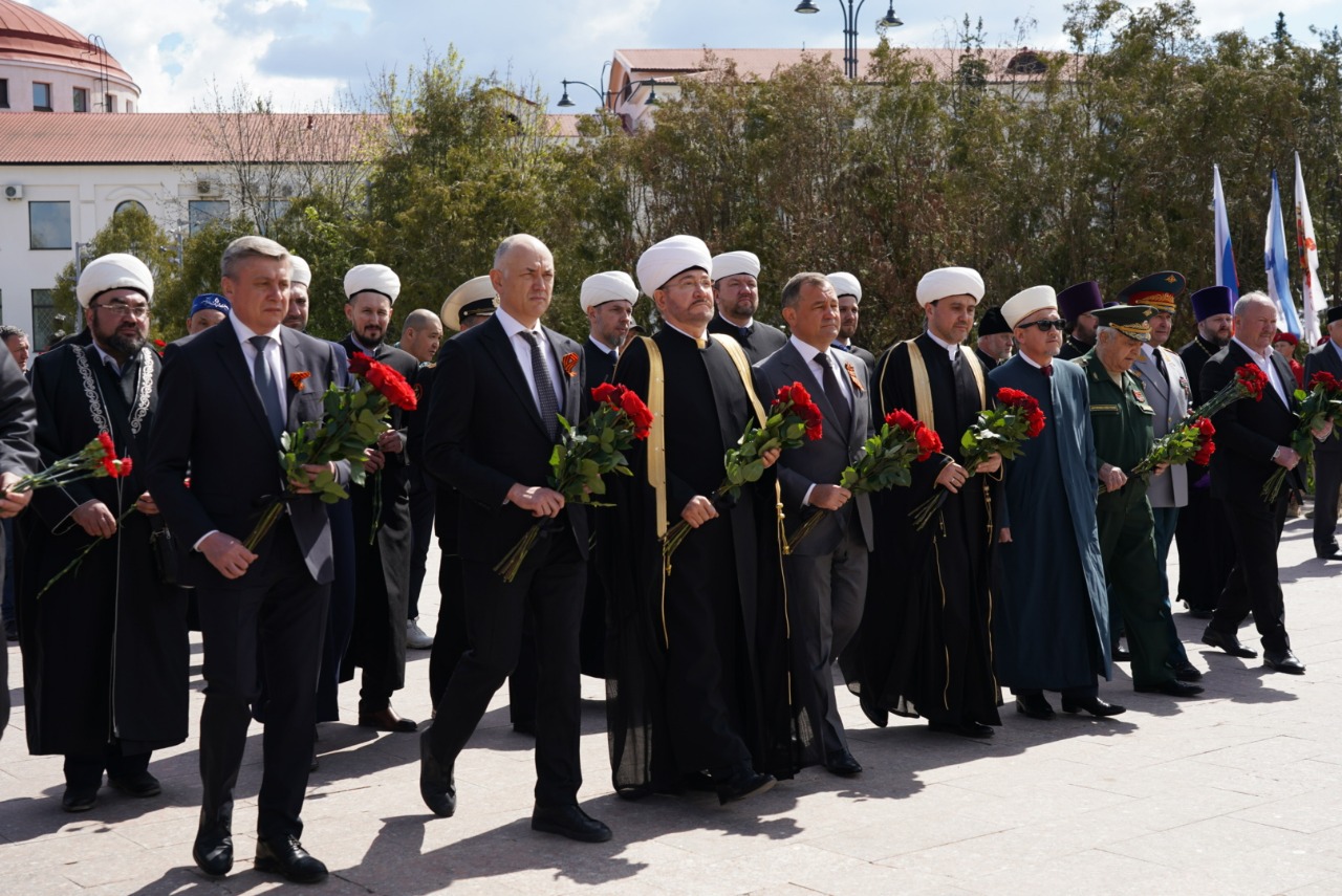 Муфтий Гайнутдин и мусульмане, участвовавшие в мероприятии, вознесли дуа-молитву о защитниках Отечества, отстоявших мир от фашизма в годы Великой Отечественной войны.