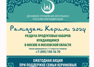 Начала работу телефонная линия по приему заявок по акции «Рамадан Керим – 2024». Нуждающиеся получат продуктовые наборы в честь священного месяца рамадан. Операторы акции дежурят по номеру +7 495 150 16 70 каждый день кроме субботы с 10.00 до 18.00. Они сообщат дату и время получения пакета из Московской Соборной мечети.