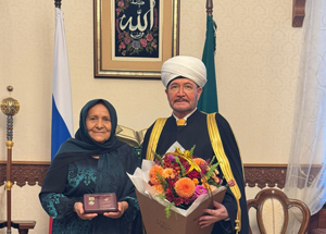 Председатель ДУМ РФ главный муфтий шейх Равиль Гайнутдин наградил уроженку Дагестана Бадуржиган Рамазанову медалью мусульман России «За заслуги».