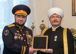Московскую Соборную мечеть посетила делегация медицинского отряда особого назначения «Урзус» во главе с командиром гвардии генерал-лейтенантом Евгением Руновым. Участников специальной военной операции принял глава Духовного управления мусульман РФ муфтий шейх Равиль Гайнутдин. Воины прибыли с линии боевого соприкосновения рассказать о фронтовых новостях и наградить духовного лидера медалью ФСВСПО «Патриот» «За гражданское мужество».