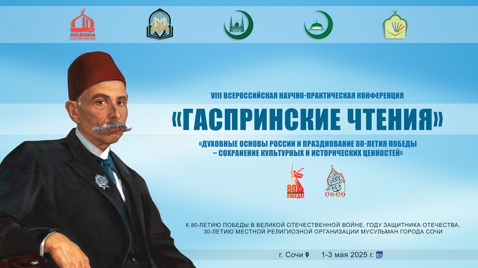 С 1 по 3 мая 2025 года в Сочи состоится VIII Всероссийская научно-практическая конференция «Гаспринские чтения» на тему «Духовные основы России и празднование 80-летия Великой Победы – сохранение культурных и исторических ценностей».Мероприятие приурочено к 80-летию Победы в Великой Отечественной войне, Году защитника Отечества и 30-летию местной мусульманской общины Сочи.