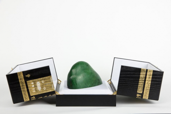 Символический камень представляет собой гладкий кусок полудрагоценного зеленого нефрита в форме верблюжьего горба. Ранее, ученые Российской Академии Наук смогли расшифровать надпись на его основании. Небольшая гравировка на древнем хиджазском диалекте содержит прямую цитату Священного Корана 2:39 и аксиому – Мухаммад посланник Всевышнего. Член-корреспондент Британской академии наук, Анатолий Алексеевич Иванов (03.07.1929 – 06.10.2020) который был главным специалистом Эрмитажа по древностям Ближнего Востока, определил артефакт как «один из первых предметов исламского искусства».