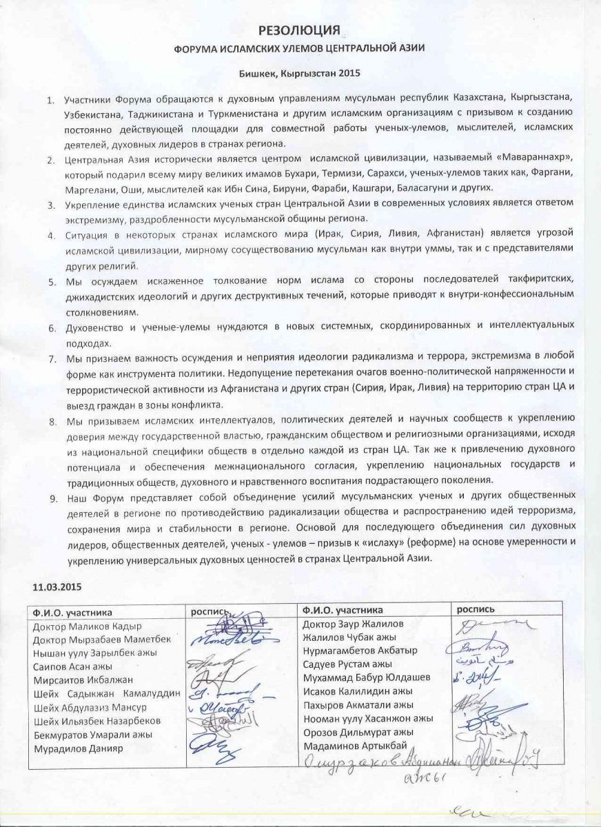 Очень важное событие для мусульман ЦА и единства исламской уммы!!! Все поддержали (ДУМ Узбекистана, Казахстана, Кыргызстана, представитель Таджикистана, улемы, исламские деятели стран ЦА). Следующий Второй Форум исламских улемов стран ЦА также пройдет в Кыргызстане в более расширенном составе с конкретной повесткой дня, третий Форум планируется в Казахстане, потом возможно в Узбекистане, Таджикистане», - заявил Кадыр Маликов.