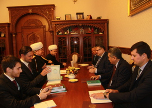 Председатель Духовного управления мусульман Российской Федерации муфтий шейх Равиль Гайнутдин принял в своей резиденции в Московской Соборной мечети Чрезвычайного и Полномочного посла Республики Казахстан в РФ Марата Тажина. Собеседники дали высокую оценку уровню развития сотрудничества двух стран в области духовного просвещения, межрелигиозного диалога и диалога цивилизаций в его религиозном и гуманитарном измерениях. В частности, было отмечено многолетнее плодотворное сотрудничество духовных управлений мусульман России и Казахстана в области книгоиздания, просвещения верующих, развития религиозного образования и подготовки мусульманского духовенства. Взаимодействие и обмен опытом в данной сфере необходимо продолжать, убежден Марат Тажин. Он особо выделил успешный опыт по организации в Москве курсов повышения квалификации для мусульманского духовенства из Казахстана. Указанные курсы впервые прошли в декабре 2014 года на базе Московского исламского института. «Возможности подготовки в России богословских кадров для Казахстана нужно использовать более широко», − резюмировал гость. Ознакомившись с новейшими богословскими изданиями ДУМ Российской Федерации и Издательского дома «Медина», М.Тажин подчеркнул: «Я хотел бы особо отметить тот вклад, который вносят Духовное управление мусульман Российской Федерации и лично Вы в дело религиозного просвещения. Нам необходимо перенять Ваш опыт в этой сфере». С его стороны прозвучало предложение о переводе на казахский язык и издании книги муфтия Гайнутдина «Введение в шариат», которая ранее уже вышла на русском, киргизском и татарском языках, а также издании в Казахстане лучших трудов российских богословов. В свою очередь, муфтий шейх Равиль Гайнутдин высоко отозвался о многолетней деятельности Республики Казахстан и ее лидера Нурсултана Назарбаева в деле развития межкультурного и межрелигиозного диалога и сотрудничества. Он высоко оценил работу Съезда лидеров мировых и традиционных религий, проводимого по инициативе Н.Назарбаева каждые 3 года. «Съезд в Астане все больше набирает авторитет и значимость во всем мире. Доказательством тому является участие в работе V Съезда в текущем году Генерального секретаря ООН Пан Ги Муна и других политических деятелей мирового уровня», − подчеркнул муфтий. Чрезвычайный и Полномочный посол Казахстана в Москве в резиденции муфтия Гайнутина Глава дипмиссии Республики Казахстан М. Тажин, в свою очередь, поблагодарил председателя Духовного управления мусульман Российской Федерации Равиля Гайнутдина за многолетнюю поддержку Съезда лидеров мировых и традиционных религий в Астане. «Мы высоко ценим Ваш вклад в деятельность Съезда. Для нас Ваша духовная поддержка очень важна, она является дополнительным стимулом к развитию межгосударственных отношений и связей между нашими народами», - заявил М. Тажин. Стороны также обсудили вопрос участия президента Республики Казахстан Нурсултана Назарбаева в церемонии открытия Московской Соборной мечети 23 сентября. «Мы не сомневаемся, что Нурсултан Абишевич не оставит нас без своей духовной и политической поддержки, без своего внимания, как он это сделал в день открытия в Москве Мемориальнойй мечети на Поклонной горе, построенной в честь воинов, павших в Великую Отечественную войн