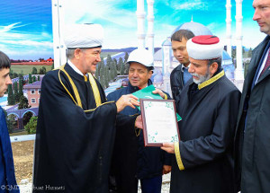 13 октября, председатель Духовного управления мусульман Российской Федерации и глава Совета муфтиев России муфтий шейх Равиль Гайнутдин в рамках своего визита в Крым посетил строительную площадку Соборной мечети (Буюк Джума Джами) в г. Симферополе, которая станет главным мусульманским культовым сооружением республики. Муфтий Крыма хаджи Эмирали Аблаев ознакомил Равиля Гайнутдина с проектной документацией, графиком и ходом строительных работ, внутренним и внешним убранством главного мусульманского храма полуострова. Глава Совета муфтиев России поздравил мусульман республики с этим долгожданным событием и передал главе Духовного управления мусульман Крыма хаджи Эмирали Аблаеву сертификат, подтверждающий пожертвование на строительство Соборной мечети г. Симферополя на сумму 3 млн рублей. Хаджи Эмирали Аблаев поблагодарил шейха Равиля Гайнутдина за внимание и поддержку мусульман Крыма и отметил, что высоко ценит сотрудничество Духовного управления мусульман Крыма и г. Севастополь с Духовным управлением мусульман Российской Федерации и Советом муфтиев России. В свою очередь, глава российских мусульман рассказал, что придает большое значение поддержке крымских татар: «Мы придаем большое значение поддержке крымских татар − наших братьев по вере и по крови. По милости Аллаха, нам удалось реализовать немало полезных для мусульман Крыма проектов при тесном сотрудничестве с муфтием Крыма хаджи Эмирали Аблаевым и Духовным управлением мусульман Республики Крым, во главе которого он стоит». В церемонии передачи сертификата приняли участие: вице-премьер Крыма Руслан Бальбек, председатель Государственного комитета по делам межнациональных отношений и депортированных граждан Республики Крым Заур Смирнов, заместитель Муфтия Крыма Айдер Исмаилов. Напомним, церемония начала строительства Соборной мечети стартовала 25 сентября, во второй день крупнейшего мусульманского праздника Курбан-байрам. В ней приняли участие представители республиканской, районной и городской власти, Фонда поддержки исламской культуры, образования и науки, лидеры всех традиционных конфессий Крыма, ветераны национального движения крымских татар, деятели культуры, общественные деятели, мусульманские религиозные общины.