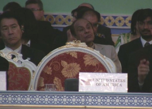 Корреспондент радио Озоди Барот Юсуфи, присутствовавший в зале заседаний правительственной дачи, сообщает, что видимо делегация США покинула заседание в знак протеста. По его словам, американская делегация вновь вернулась на свои места только после того, как иранский президент завершил свое выступление.