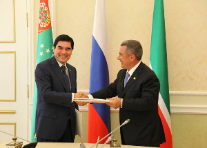 Народы Туркменистана и Республики Татарстан - как одного из регионов Российской Федерации – связывают глубокие духовно-культурные узы, многолетние торгово-экономические и научно-технические отношения, которые характеризуются доверием, конструктивностью и содержательностью. Об этом заявил 16 мая Президент Республики Татарстан Рустам Минниханов в ходе встречи с Президентом Туркменистана Гурбангулы Бердымухамедовым, сообщает пресс-служба Президента Республики Татарстан. Ваш визит в Казань даст новый толчок к дальнейшему развитию наших отношений, сказал Рустам Минниханов, обращаясь к Гурбангулы Бердымухамедову, мы ценим ваше отношение к народу Татарстана. Рустам Минниханов подчеркнул, что народы Татарстана и Туркменистана объединяет многое – это язык, культура, традиции. Наши народы близки по духу, сказал он. В свою очередь, Президент Туркменистана Гурбангулы Бердымухамедов также поблагодарил Рустама Минниханова за приглашение посетить Татарстан в рамках пребывания в России. Он сообщил, что в Москве встречался с Президентом Российской Федерации Владимиром Путиным, и в ходе встречи было отмечено, что Россия и Туркменистан имеют добрые дружественные отношения. Я рад, что мы также дружим с регионами России, заявил Гурбангулы Бердымухамедов, особенно с Республикой Татарстан. По словам Гурбангулы Бердымухамедова, Татарстан и Туркменистан имеют взаимопонимание по всем вопросам, доверие, активно сотрудничают по целому спектру социально-культурных вопросов. Мы действительно близки по духу и менталитету, сказал Гурбангулы Бердымухамедов. Далее Президент Туркменистана отметил, что в сфере экономических отношений серьезные партнерские контакты налажены с такими промышленными предприятиями Татарстана, как ОАО «КАМАЗ», ОАО «Татнефть», ОАО «Казанский вертолетный завод» и другими. Он поблагодарил за сотрудничество в нефтегазовой сфере и за возможность использования современных технологий в области нефтеотдачи пластов. Сегодня Туркменистан делает основной упор на индустриализацию, сказал Гурбангулы Бердымухамедов, в стране принят стратегический документ – Программа социально-экономического развития на 2012-2016 годы, и мы готовы сотрудничать во многих вопросах. Затем прошла встреча в расширенном составе – в ней приняли участие члены официальной делегации Туркменистана, сопровождающие Гурбангулы Бердымухамедова, Премьер-министр Республики Татарстан Ильдар Халиков, председатель Государственного Совета РТ Фарид Мухаметшин, министры Республики Татарстан, генеральный директор ОАО «КАМАЗ» Сергей Когогин, генеральный директор ОАО «Татнефть» Шафагат Тахаутдинов и другие. Гостям из Туркмении презентовали промышленный потенциал Татарстана, ознакомили с деятельностью ряда крупных предприятий республики. Так, 15 мая состоялось посещение ОАО «ТАНЕКО» и завода цельнометаллокордных шин (Нижнекамский район), территории особой экономической зоны «Алабуга» (Елабужский район), а также Казанского вертолетного завода и др. Делегация Туркменистана также посетила вузы республики, министерства и ведомства Татарстана. Стороны по итогам встречи подписали документ о сотрудничестве в торгово-экономической и культурно-гуманитарной областях на 2012-2014 годы, что позволит еще более активно реализовывать достигнутые договоренност