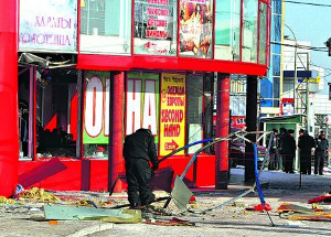 КАК БЫЛО. Сначала рвануло у торгового центра «Голден Плаза» около 4.30 утра (как стало известно, заминировали телефонную будку). А спустя 40 минут взорвалась урна у входа в 7-этажное здание ГП «Макеевуголь», расположенное напротив мэрии. Волна от первого взрыва была такой силы, что повредила окна расположенного через дорогу жилого дома №70 на ул. Московской. Напротив взорванного магазина находятся оживленный рынок и остановки транспорта. Если бы взрывчатка рванула на пару часов позже, то кровавой драмы было бы не избежать.