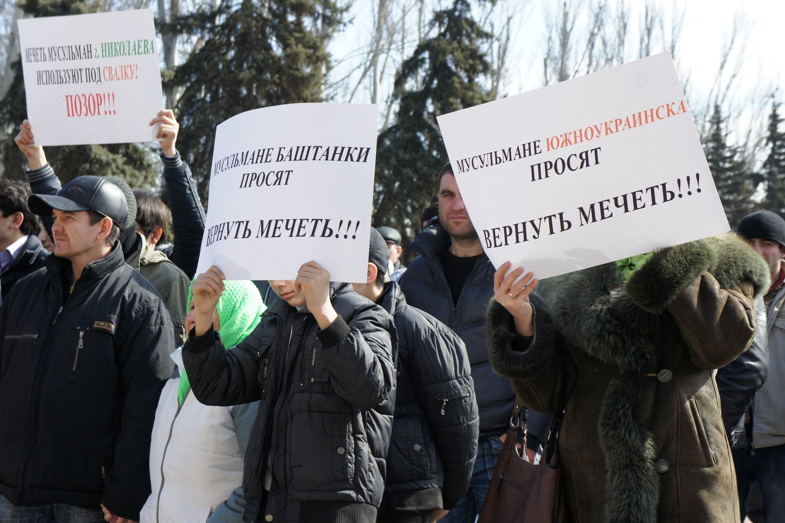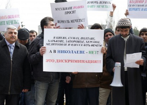 Николаев всегда был относительно спокойным городом по части межэтнических отношений. В особенности, если речь идет о вопросах веры и религии национальных меньшинств, которые проживают на территории города и области. По заявлениям местных чиновников разного уровня, численность таких групп, проживающих в Николаевской области, составляет добрую сотню. Вполне естественно, что у многих из них – свой собственный быт, культура, традиции, внутренний уклад и своя религия, своя вера, то есть, те базисные принципы жизни их общества, которые они всячески стараются соблюдать. А то, что люди, представляющие такие национальные меньшинства, до сих пор громогласно не заявляли о своих проблемах, местные власти, почему-то, приписывают в свои заслуги. Дескать, у нас все живут мирно и все всем довольны. На деле же это оказывается совсем не так. Словосочетание «до сих пор» здесь более чем уместно, если вспомнить как 13 марта мусульмане, проживающие как в самом Николаеве, так и в области, пришли пикетировать мэрию. Единственное требование, которое они выдвигали к городской власти, состояло в том, чтобы мусульманам вернули их мечеть. Точнее даже не само здание, так как оно до основания разрушено, а землю, на которой она когда-то размещалась. В тот день с плакатами на пикет к мэрии пришло около 100-ти человек. И, по словам самих собравшихся, это далеко не все представители исламской веры, а только лишь малая их часть, которая смогла прийти под стены власть предержащих. Люди скандировали: «Верните мечеть!». Надписи на плакатах призывали власть одуматься и отдать законную землю общины: «Владимир Дмитриевич, где мусульмане должны молиться? Верните нашу мечеть»; «Мусульмане города Николаева просят президента Украины помочь вернуть нашу мечеть»; «Хватит давать обещания, верните мечеть!».