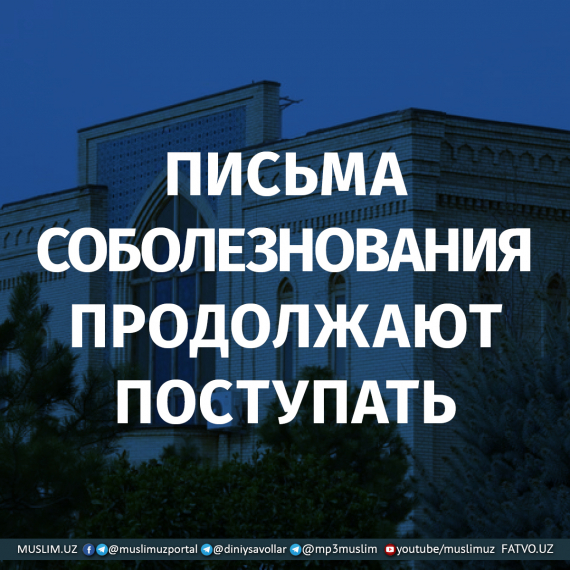 По случаю кончины председателя Управления мусульман Узбекистана муфтия Усмонхона Алимова направляются письма соболезнования от имени муфтиев зарубежных стран, руководителей влиятельных организаций, государственных и религиозных деятелей.