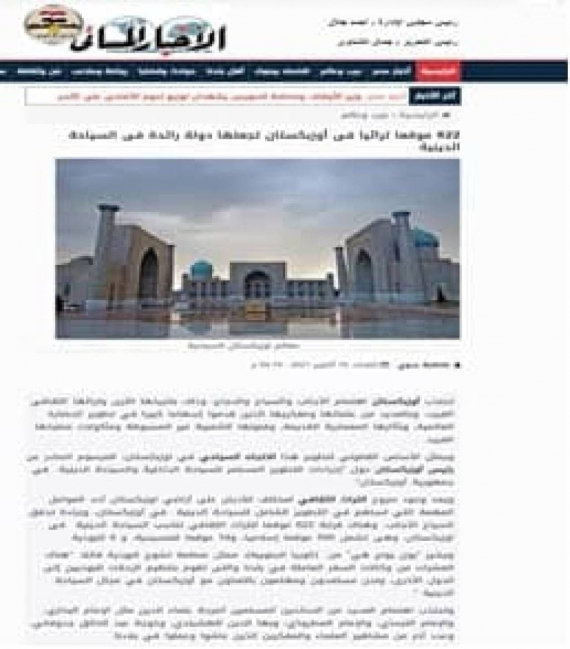 Узбекистан с его богатой историей, уникальным культурным наследием, множеством ученых и мыслителей, внесших значительный вклад в развитие мировой цивилизации, древними архитектурными памятниками, неповторимой кулинарией и народным искусством притягивает к себе внимание иностранцев, туристов и паломников, пишет египетсткое издание «Аль-Масаи Ахбар аль-Йаум».