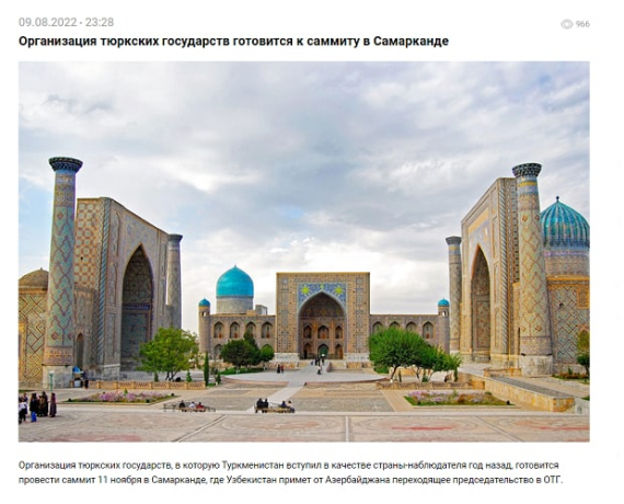 Туркменское информационное агентство «Orient» опубликовало на своем портале статью под заголовком «Организация тюркских государств готовится к саммиту в Самарканде», сообщает ИА «Дунё».