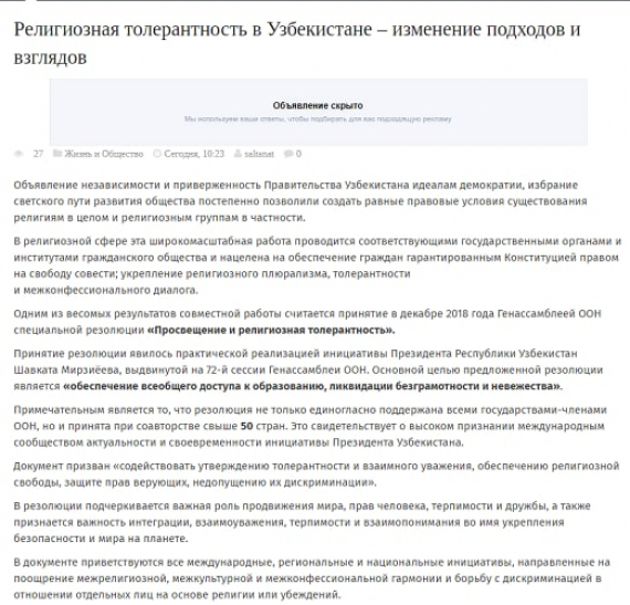 Наряду с этим, говорится, что Узбекистан последовательно и неукоснительно выполняет свои международные обязательства в области обеспечения религиозных свобод в рамках международных договоров по правам человека.