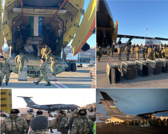 По информации МИД Узбекистана, самолёт доставил груз в 40 тонн, в который входят полевые кухни, полевой госпиталь и группа военных медиков в составе 71 человека, а также поисковые собаки.
