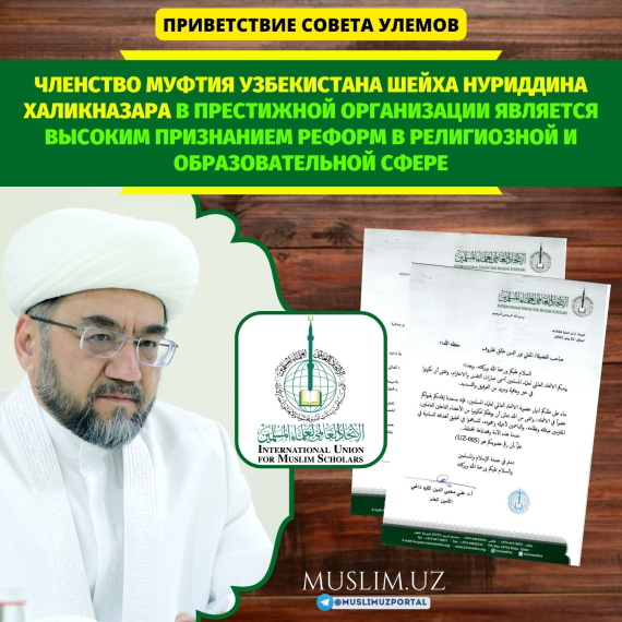Недавно председатель Управления мусульман Узбекистана, муфтий шейх Нуриддин Холикназар хазрат был принят в члены Международного союза мусульманских ученых и начал работать в рядах этой международной организации, что стало огромным результатом столь значимой работы. Также этот статус является международным признанием реформ в религиозно-образовательной сфере, проводимых в новом Узбекистане, и является высокой оценкой вклада улемов нашей страны в развитие нашей религии.