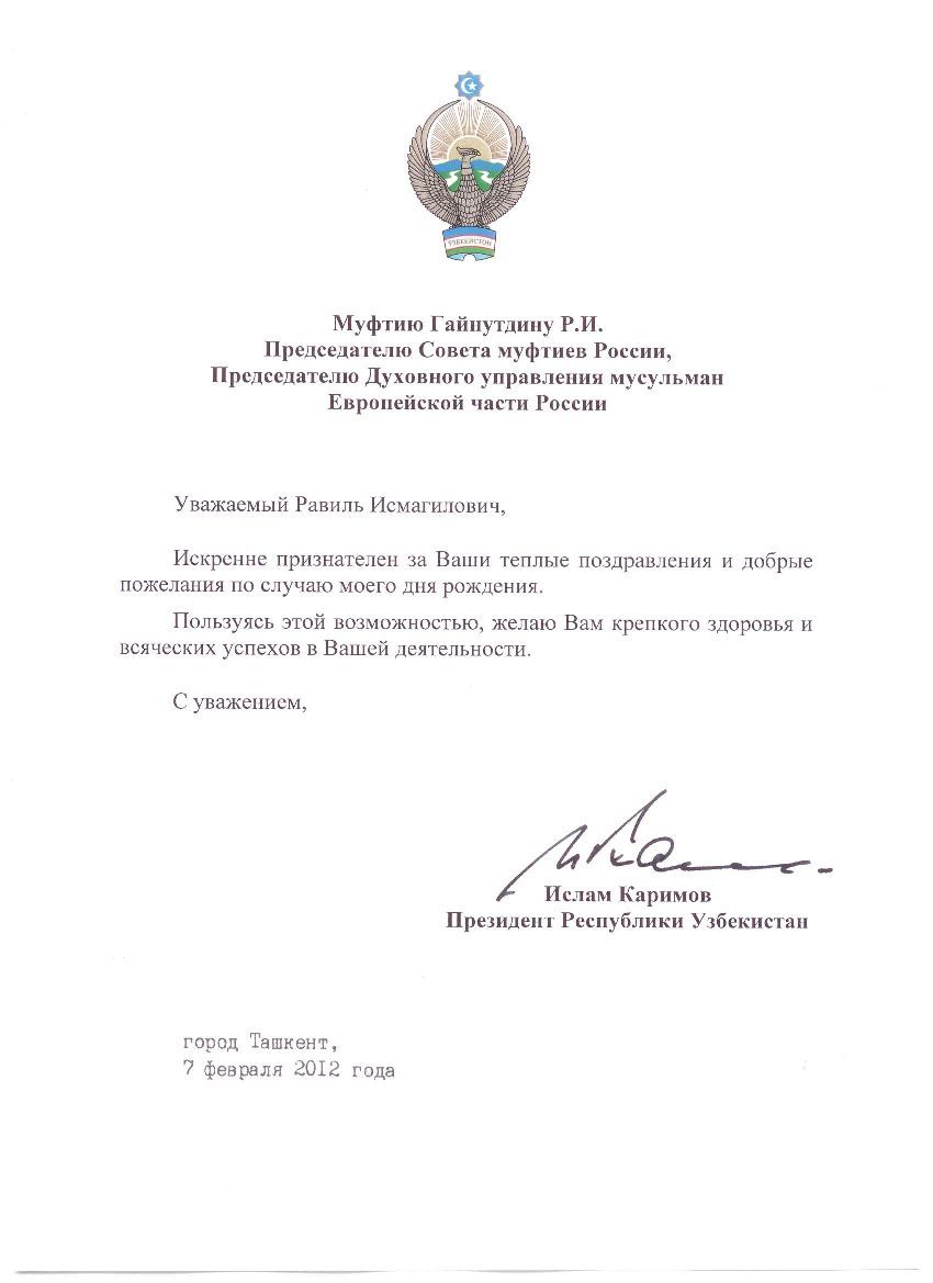 «Пользуясь этой возможностью, желаю Вам крепкого здоровья и всяческих успехов в Вашей деятельности», - завершает письмо президент Узбекистана Ислам Каримов.